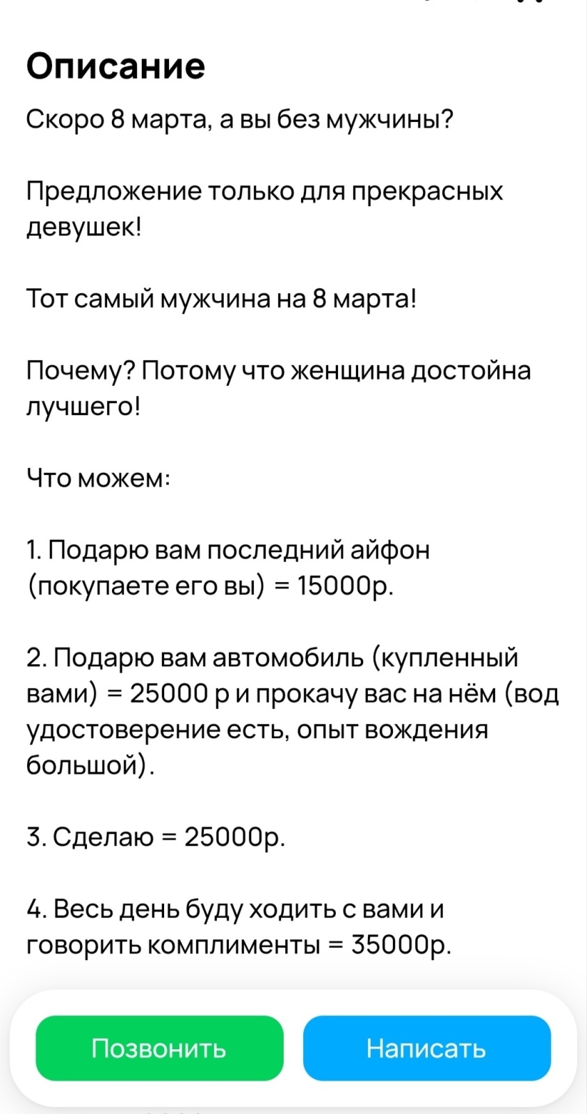 Но что делать тем женщинам, которые в свой праздник остались одни? Не расстраиваться! На помощь всегда придут услуги Avito. На данном сайте представлена услуга «Мужчина на 8 Марта»: разнообразие кандидатов «в мужья» большое, выбирайте себе «по душе».
