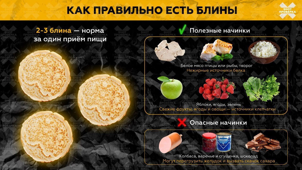 Мария Жарова, старший лаборант кафедры гастроэнтерологии Пироговского университета, рассказала, что можно съесть всего 2–3 блина за приём пищи.
