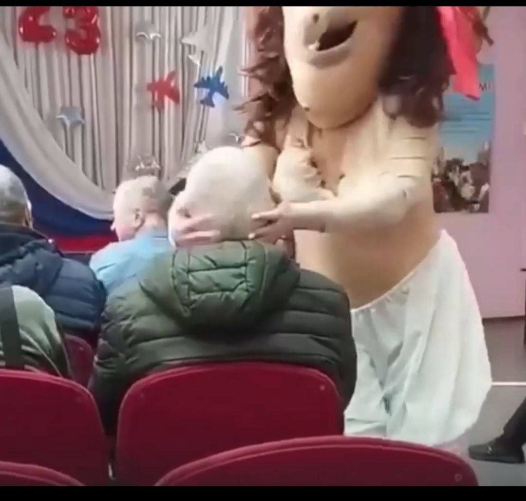В сети гуляет ролик, где аниматор в костюме бабки скинул одежду и остался в одних пантолонах.