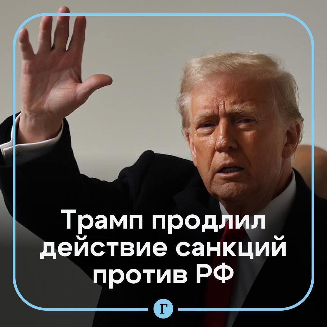 "Президент США Дональд Трамп продлил на год санкции против России, введенные в 2014, 2018 и 2022 годах. Документ пока не опубликован, но уже есть в базе данных Федерального реестра США. Это вряд ли стало большой неожиданностью: и сам Трамп, и госсекретарь Марко Рубио недавно говорили, что Соединенные Штаты не отменят санкции против России, пока не будет достигнуто соглашение о прекращении конфликта на Украине."