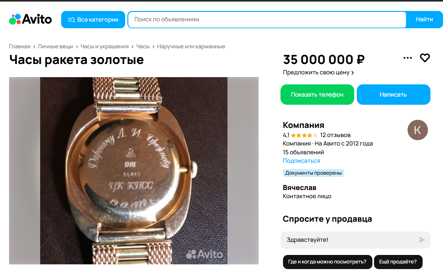 На «Авито» за 35 миллионов рублей продают невыкупленные из ломбарда часы Леонида Брежнева