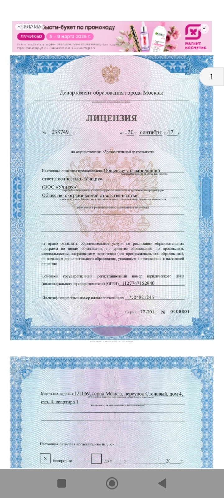 Учи.ру — образовательная платформа. Образовательная и любая другая деятельность частной лавочки, если вид деятельности предусматривает получение лицензии, осуществляется на основании лицензии.