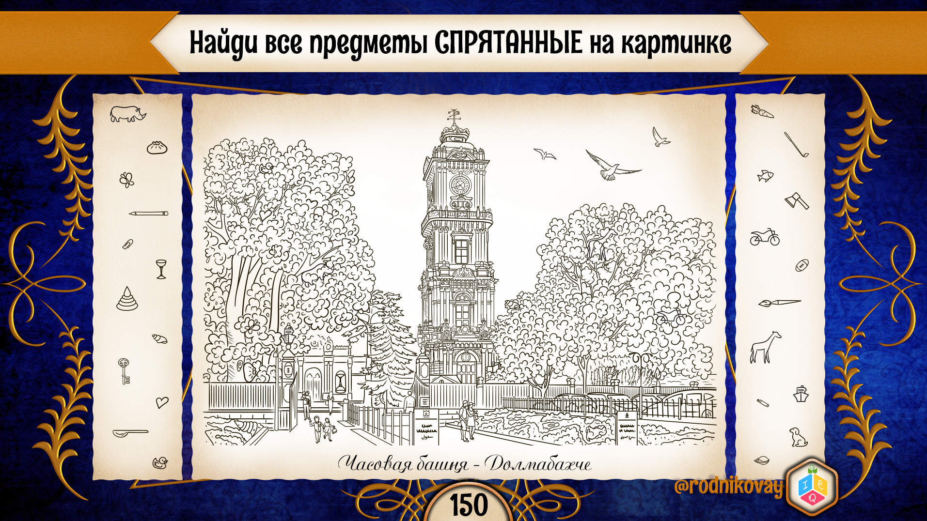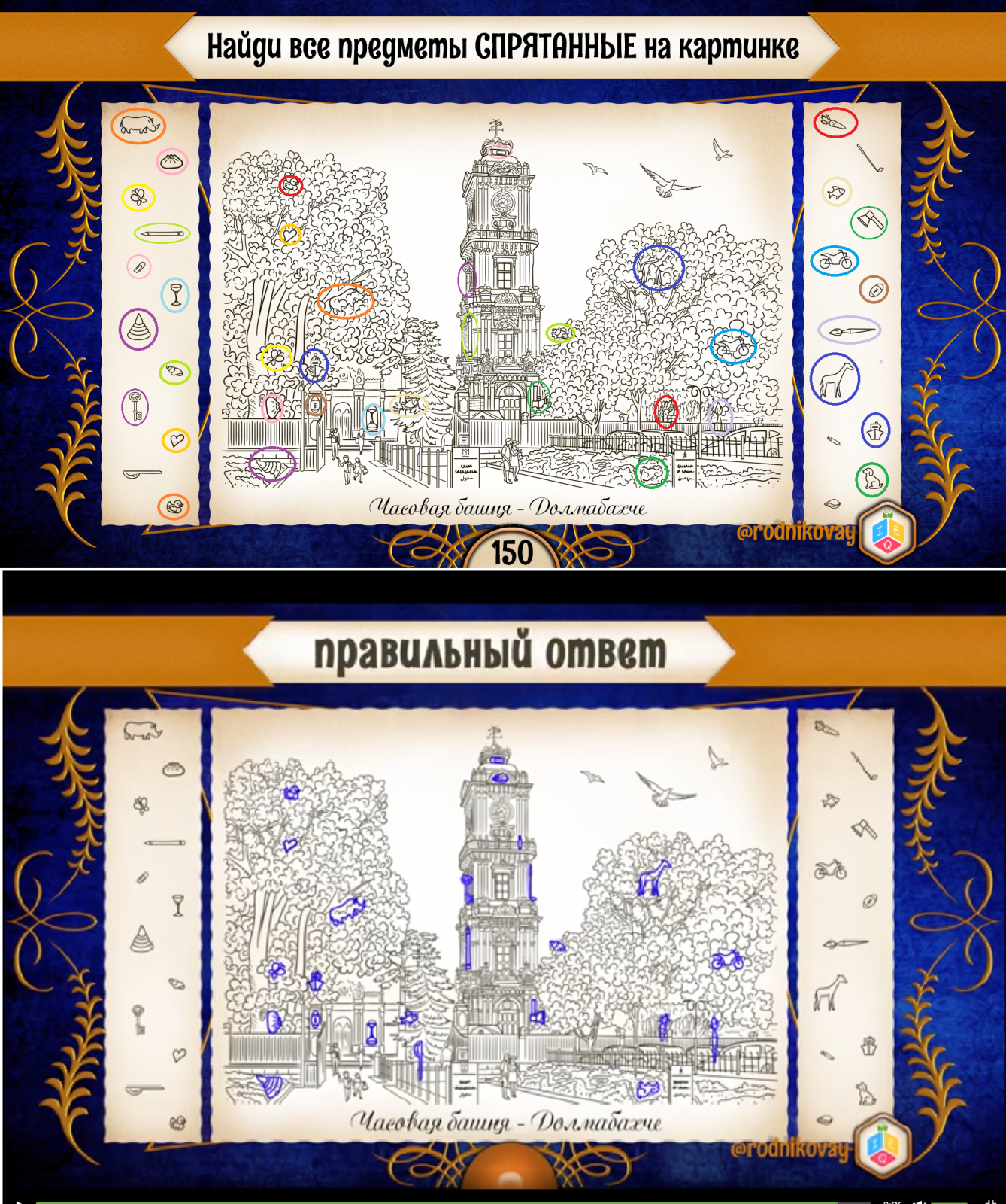 Сложная головоломка из-за наличия большого количества простых по форме и небольших по размеру предметов. Прилагаю копию рисунка с найденными предметами в определенном автором тайминг.