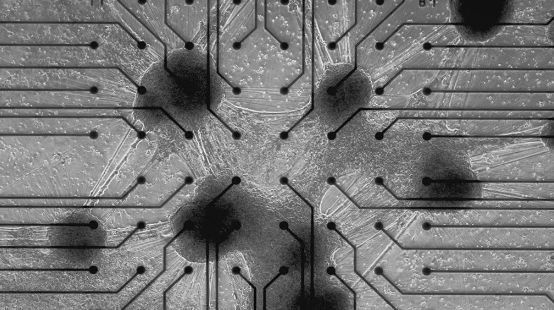Это нейроны человеческого мозга, соединенные с электродами. Через компьютер, в который заложена программа, посылающая нужные сигналы нейронам и получающая ответ, и происходит развитие нейронной сети и ее обучение. А интегрированная система жизнеобеспечения обеспечивает здоровье клеток..