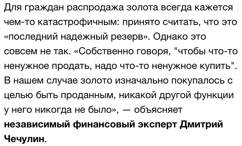 Независимый финансовый эксперт Дмитрий Чечулин еще в 2021 году объяснял действия ЦБ по продаже золота, считая их обоснованными: