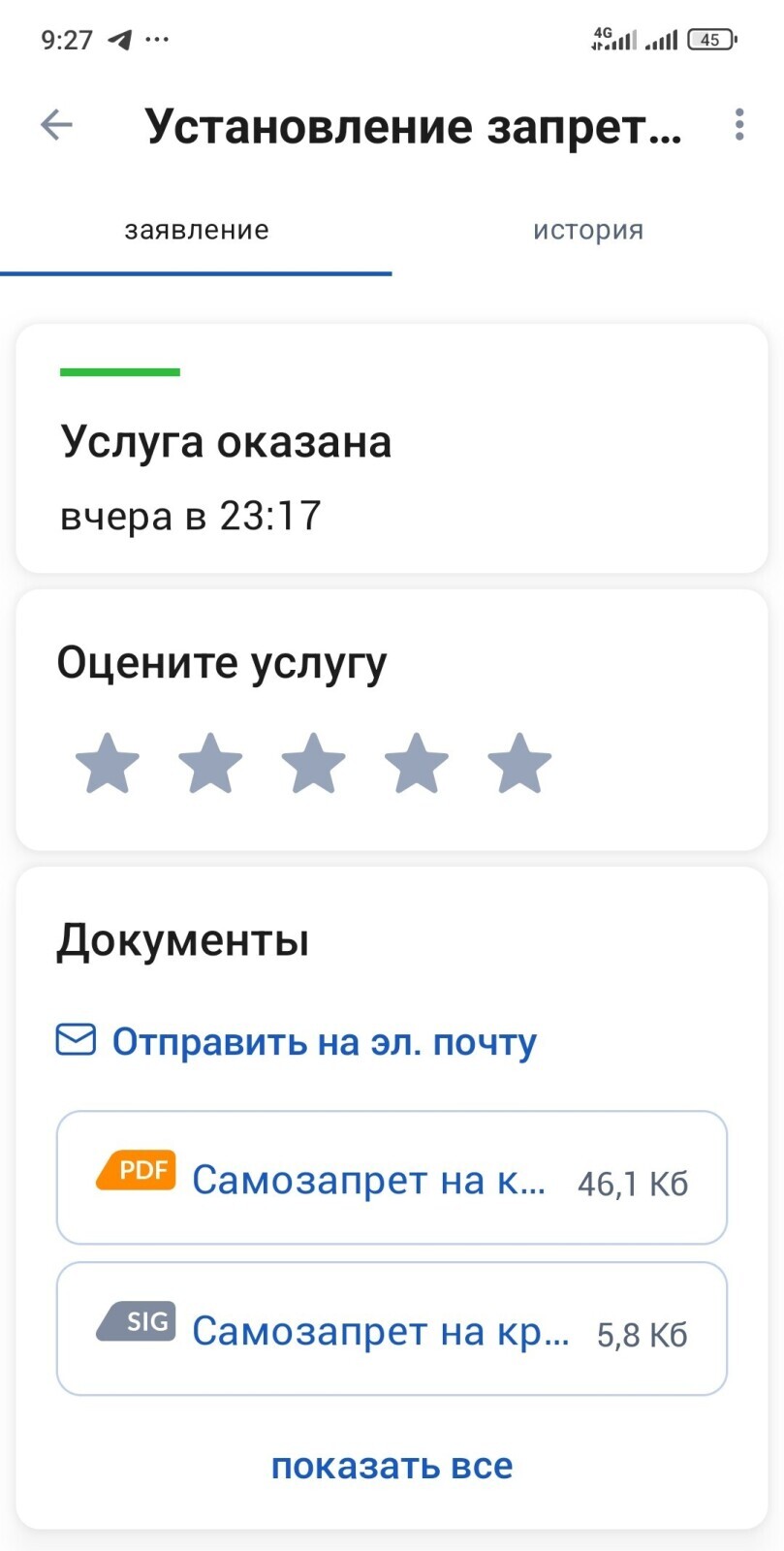 Заявление отправляется в ведомство. Через несколько часов самозапрет установлен.