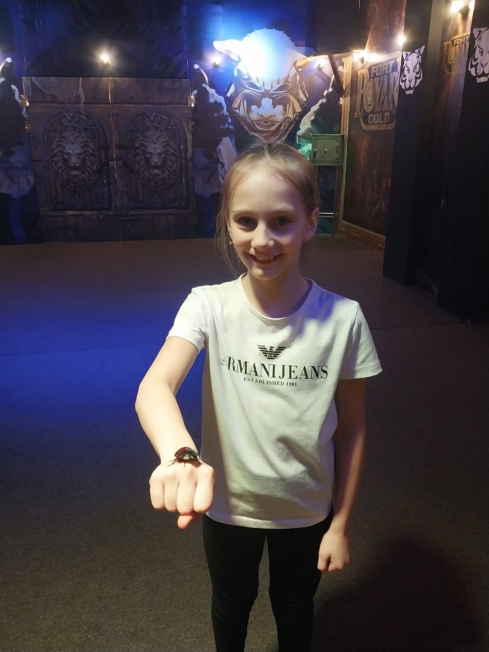 Как вы уже поняли по фотографии выше, где находится моя дочка, змей мы не просто не боимся, но вполне себе уважаем! В квесте нужно было доставать из ящиков монетки, а там находились змеи, тараканы и крысы. Крысу нам поймать не удалось, она не слишком хотела фотографироваться, как бы мой ребёнок не старался. А вот у таракана Валеры выбора не было! Вот он, кстати.