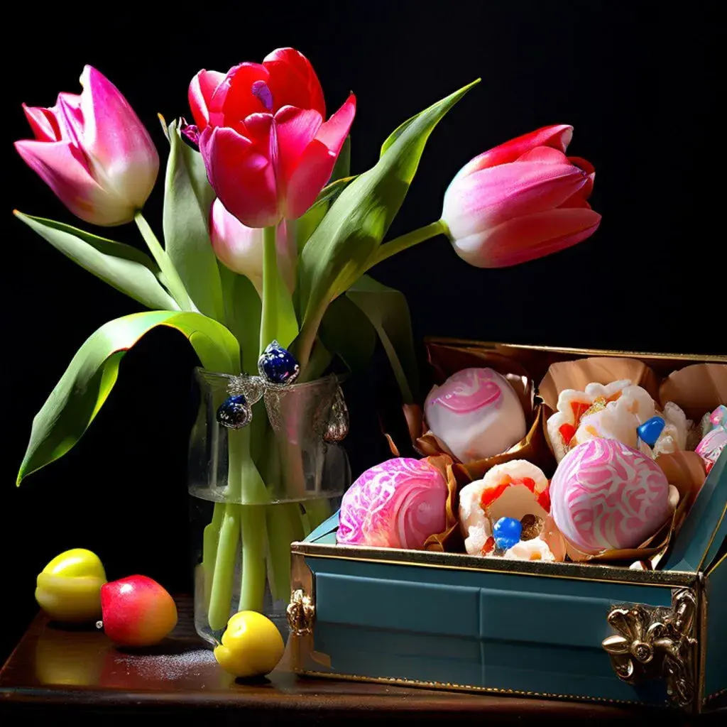 Вечером, 6-го числа мы сходили с ним в цветочный магазин и купили 2 букетика тюльпанов, и ещё он прихватил коробочку конфет для Оли.