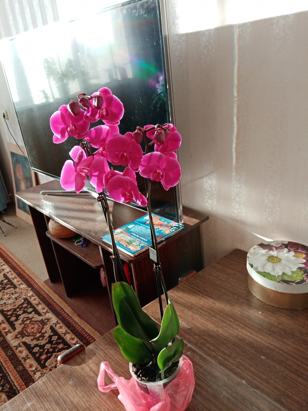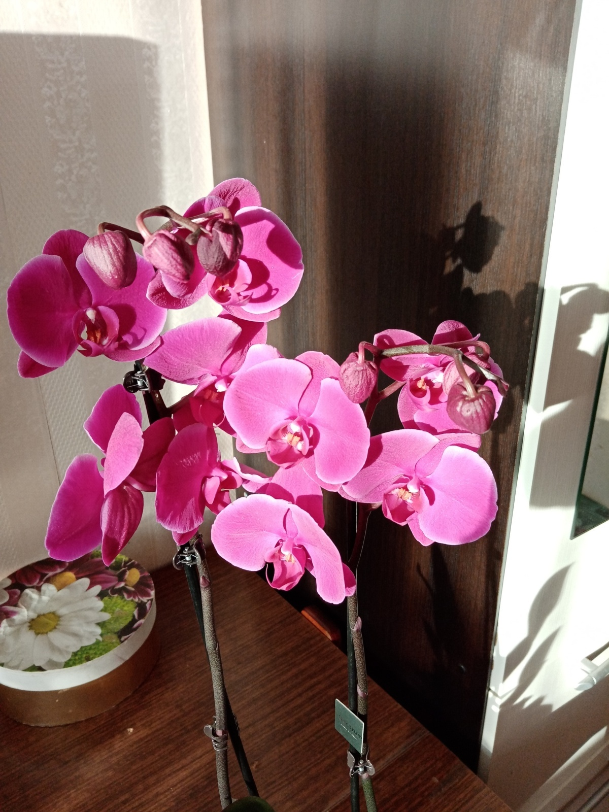 Букетов несколько, но самый красивый, который меня просто привёл в восторг, так вот эта бордово-розовая орхидея. В горшке три куста. Пока я трогать горшок не буду, лишь немного полила водой - пусть цветок привыкнет к нашей домашней атмосфере.