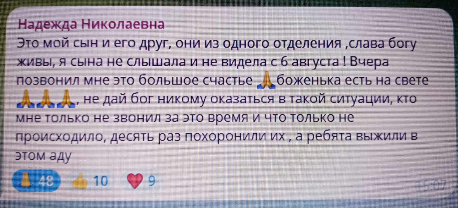 Когда наша 11-я бригада на окраине Суджи встречала людей, выходящих из освобожденной зоны, среди них увидели двух пареньков. Один из них вёз пожилого мужчину в инвалидной коляске. Как оказалось, это были два солдата-срочника, которым повезло — они выжили, проведя более полугода в оккупации.