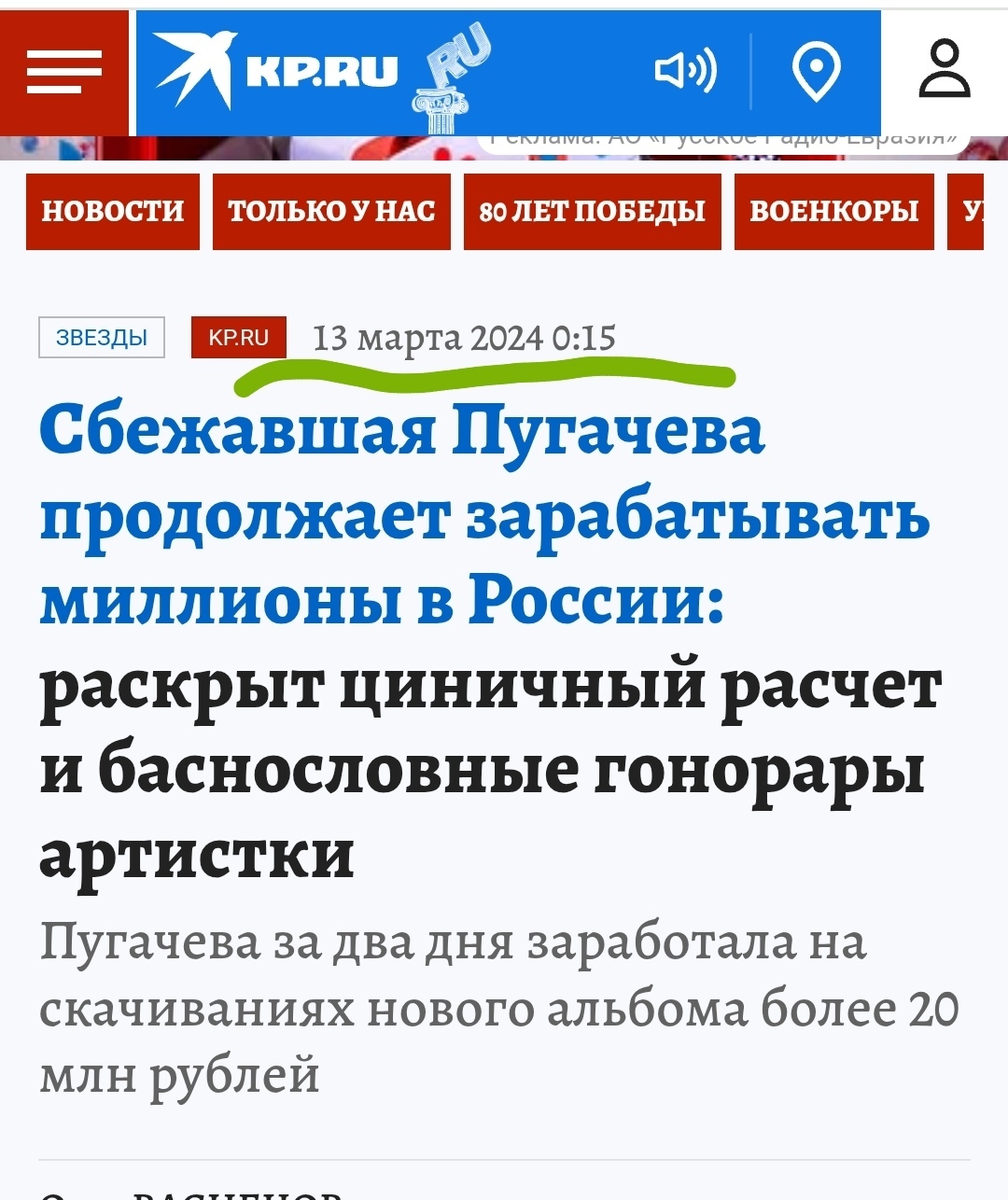 Не выдумывайте, Анна! Я поделилась с читателем как Алла Борисовна Пугачёва за 2 дня заработала более 20 миллионов рублей!Этого что? Не было???