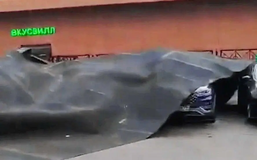 Порывами сильного ветра сорвало рубероид с крыши ТЦ и он в плавном падении приземлился на припаркованные рядом с ним автомобили: