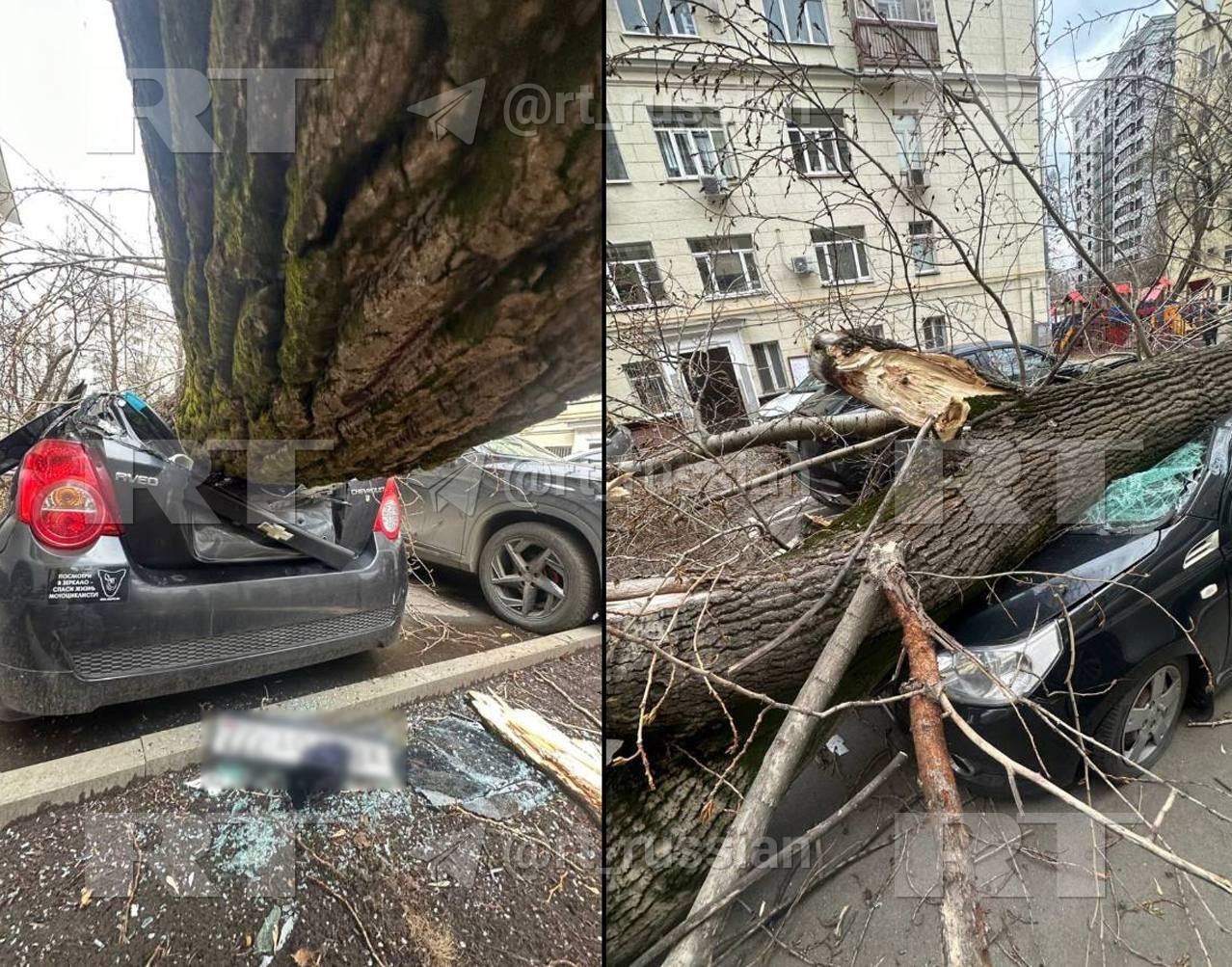 "Ветер повалил дерево на авто на улице Талалихина в Москве. Кадры прислал подписчик RT.