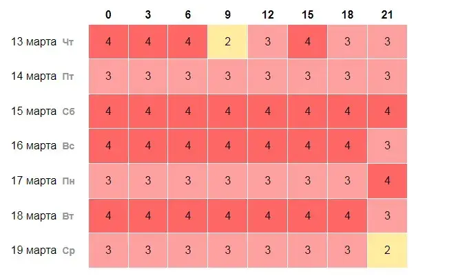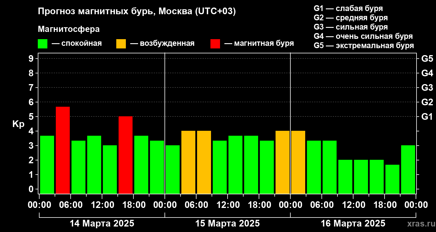 По предварительным прогнозам экспертов, в пятницу, 14 марта, на планете ожидается крайне нестабильная геомагнитная обстановка с двумя периодами магнитных бурь. Первый из них произойдёт утром с 09:00 до 11:00 по московскому времени: магнитная буря ожидается с силой 6 баллов. После этого будет кратковременное успокоение, однако вечерняя магнитная буря всё же не обойдёт нас стороной. Она ожидается с 20:00 до 22:00 по московскому времени, и её сила составит не более 4 баллов.