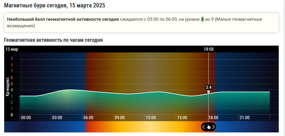 Уровень геомагнитной активности измеряется по шкале от 0 до 9. 17 марта 2025 года максимальная активность ожидается с 03:00 по 06:00 на уровне 3.67, что соответствует категории "малые геомагнитные возмущения". Это не самое мощное из возможных явлений, но все равно может оказать влияние на Землю и её обитателей.