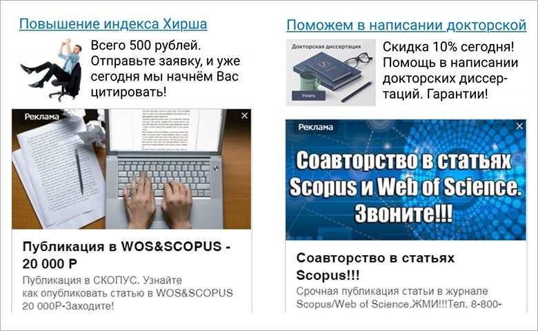 В последние 10 - 15 лет интернет кишит рекламой быстрого увеличения индекса Хирша, по оказанию помощи в публикациях ВАК, Scopus, WoS. Появилось большое количество «якобы» научных журналов, которые за определённую плату и опубликуют ваши результаты исследований, и обеспечат нужное количество цитирования.