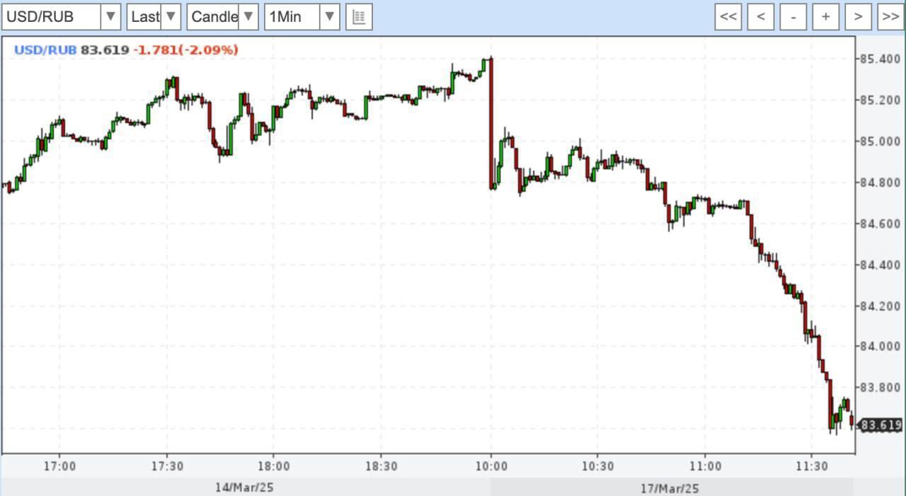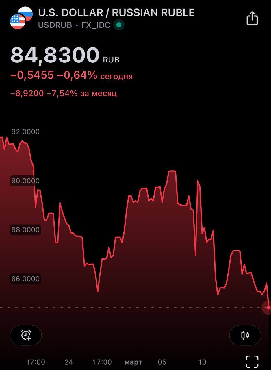 Строго вниз. Курс доллара года упал ниже 83 рублей впервые с 27 августа 2024, евро — дешевле 90 рублей