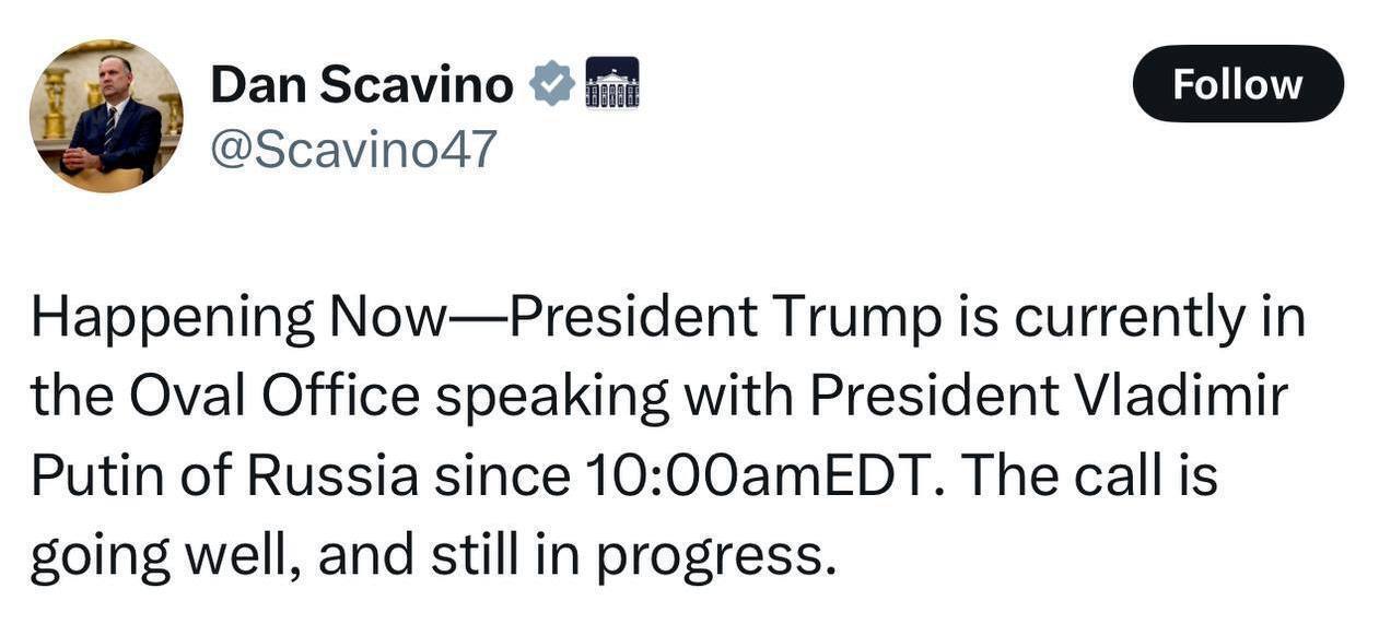«То, что происходит сейчас — Президент Трамп в настоящее время находится в Овальном кабинете, разговаривая с президентом России Владимиром Путиным с 10:00 утра по местному времени. Звонок проходит хорошо и все еще продолжается».