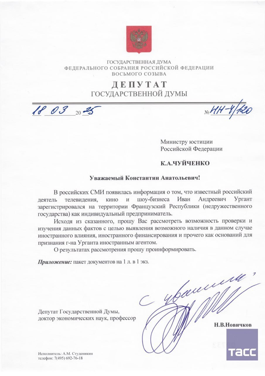 В своем обращении парламентарий требует проверить информацию и на ее основании признать Ивана Урганта - иностранным агентом: