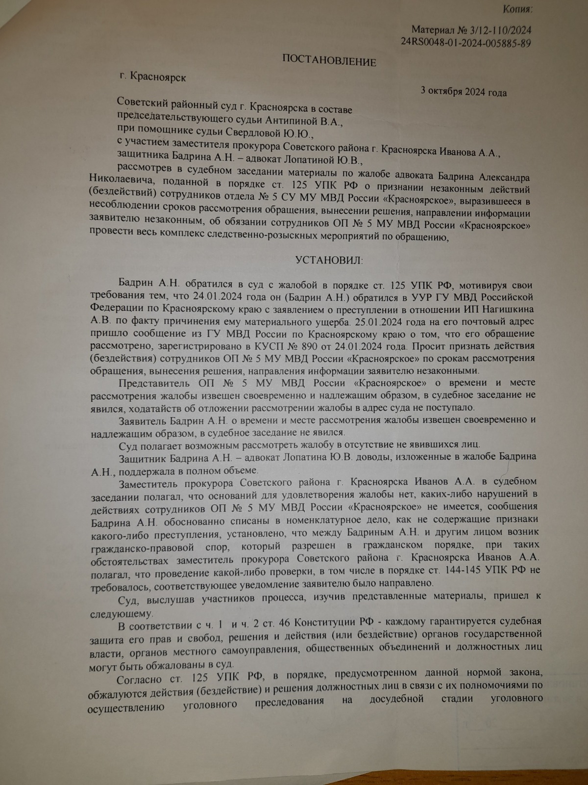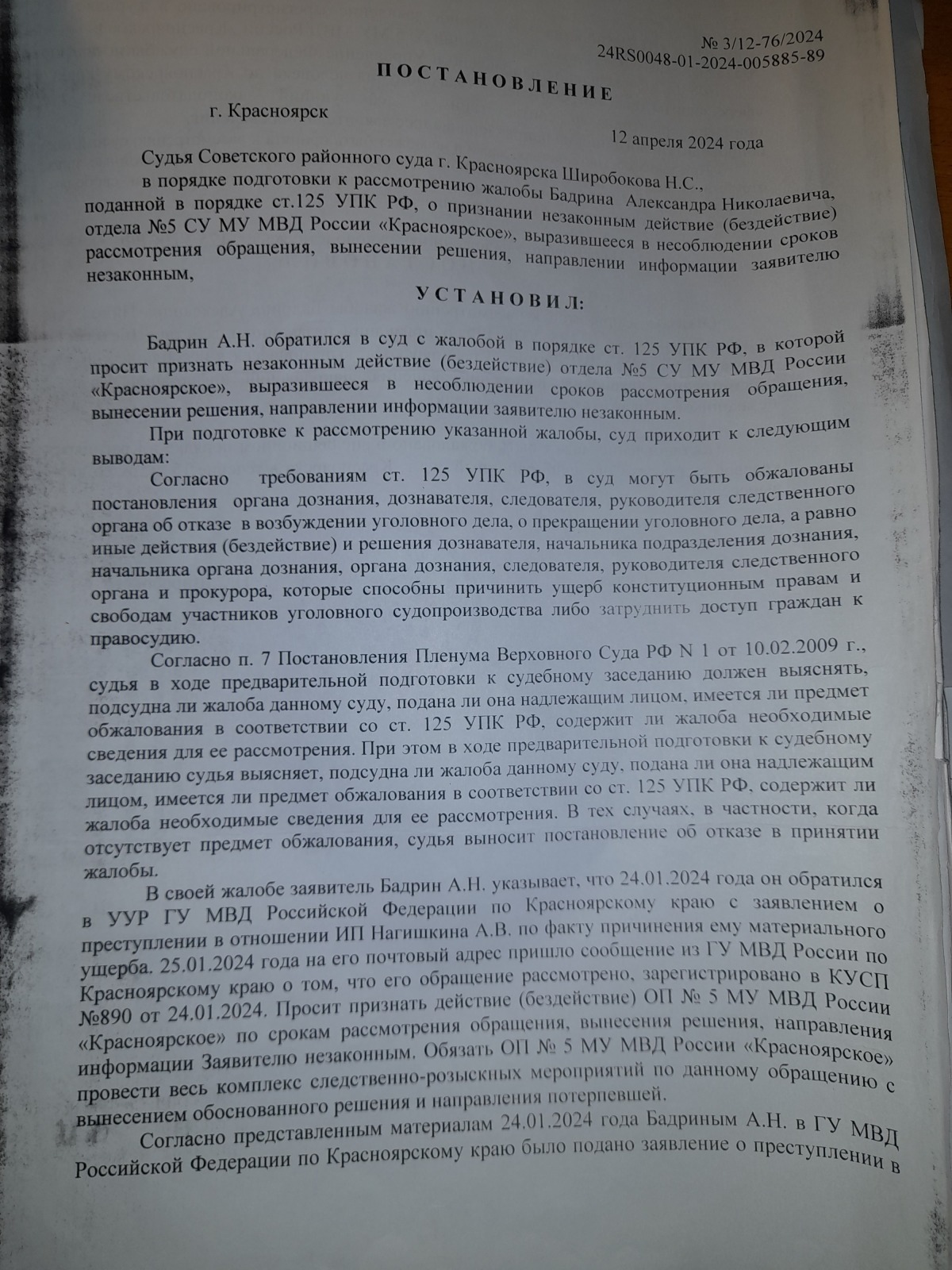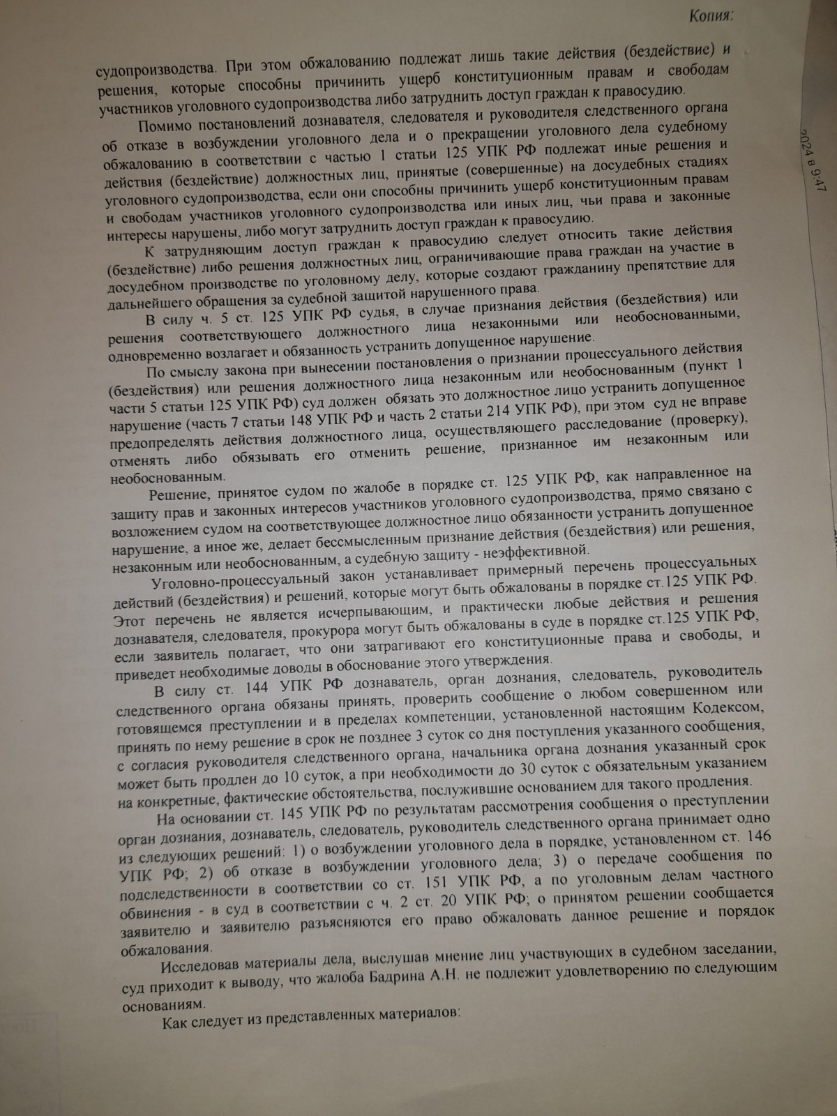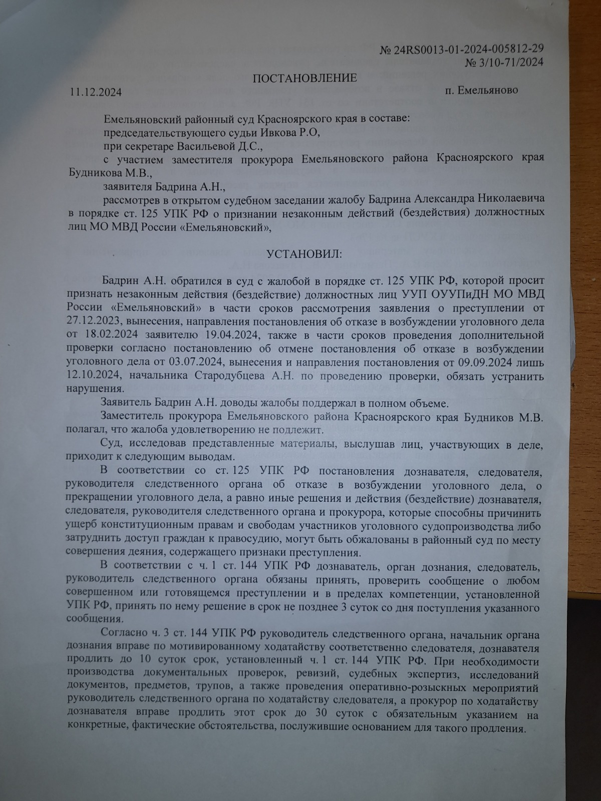 и вынесен вот такой судебный акт- полная галиматья особенно по вторичному отказу в возбуждении уголовного дела 09.09.2024 года, которое непонятно ВЫНОСИЛОСЬ ИЛИ НЕТ?