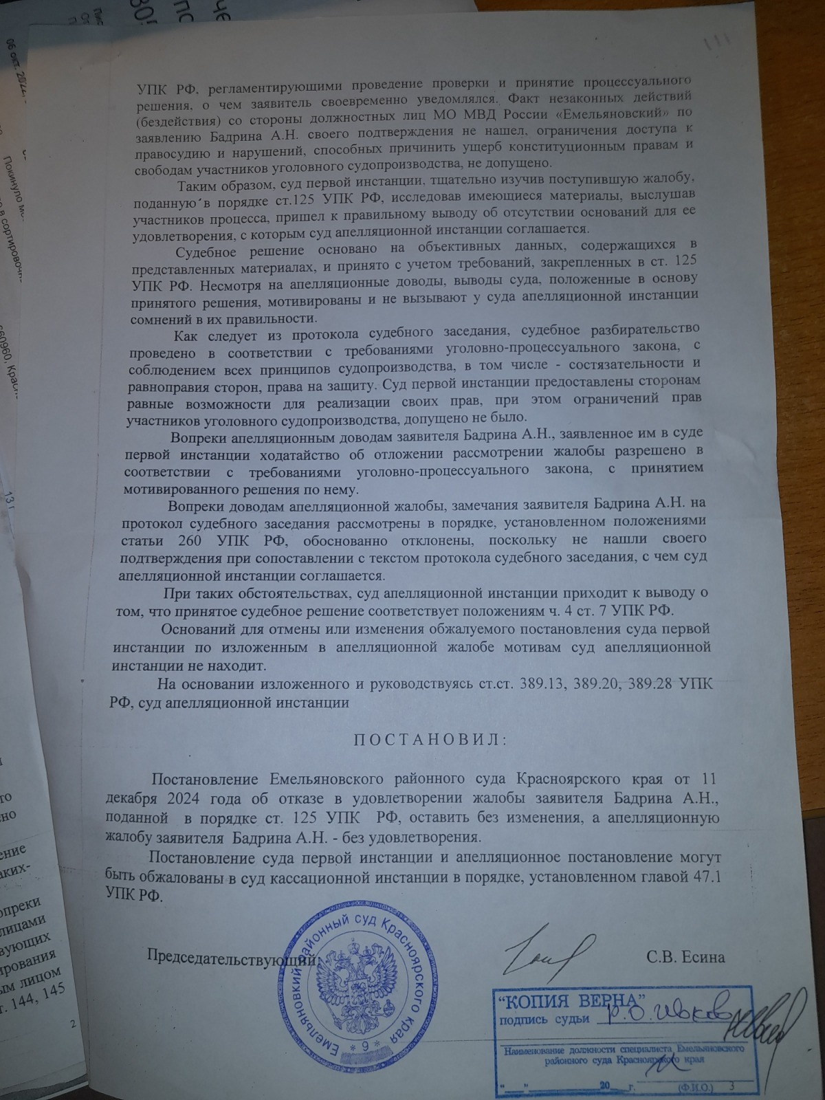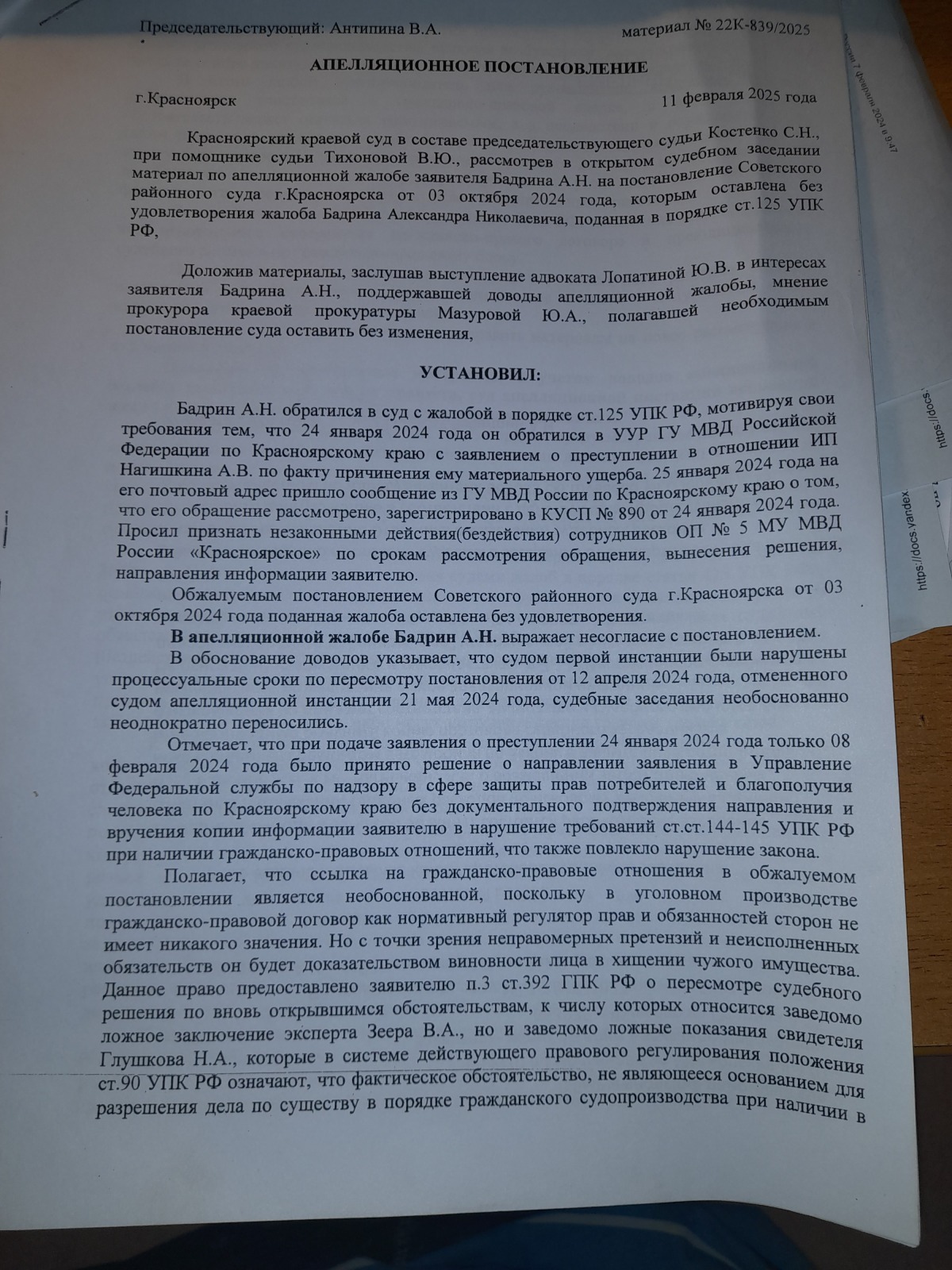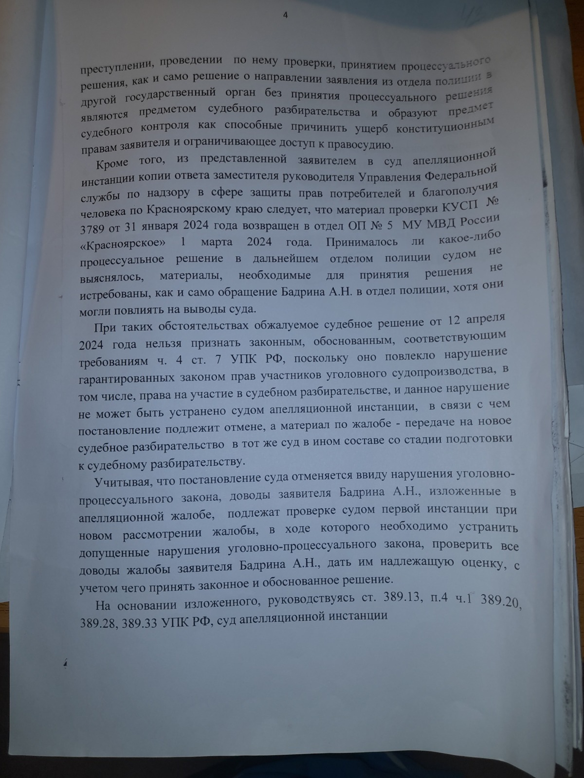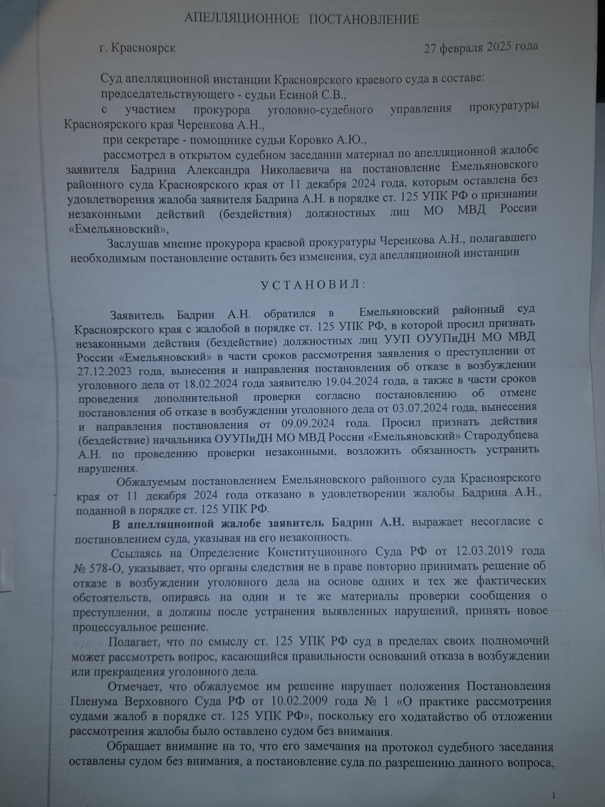 подана апелляционная жалоба и согласно апелляционного постановления сложилось впечатление, что правосудие в Красноярском крае существует