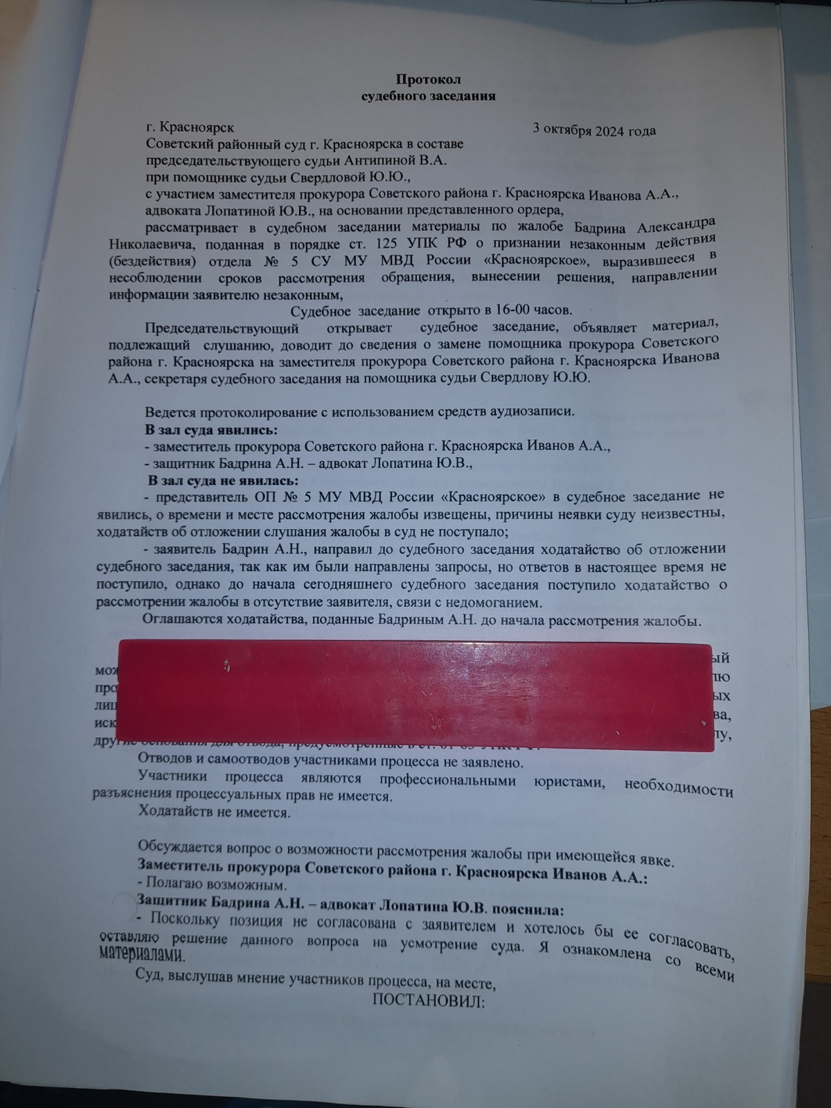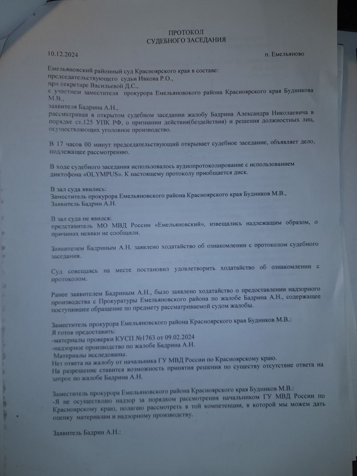 которое интересным образом отражено в протоколе судебного заседания