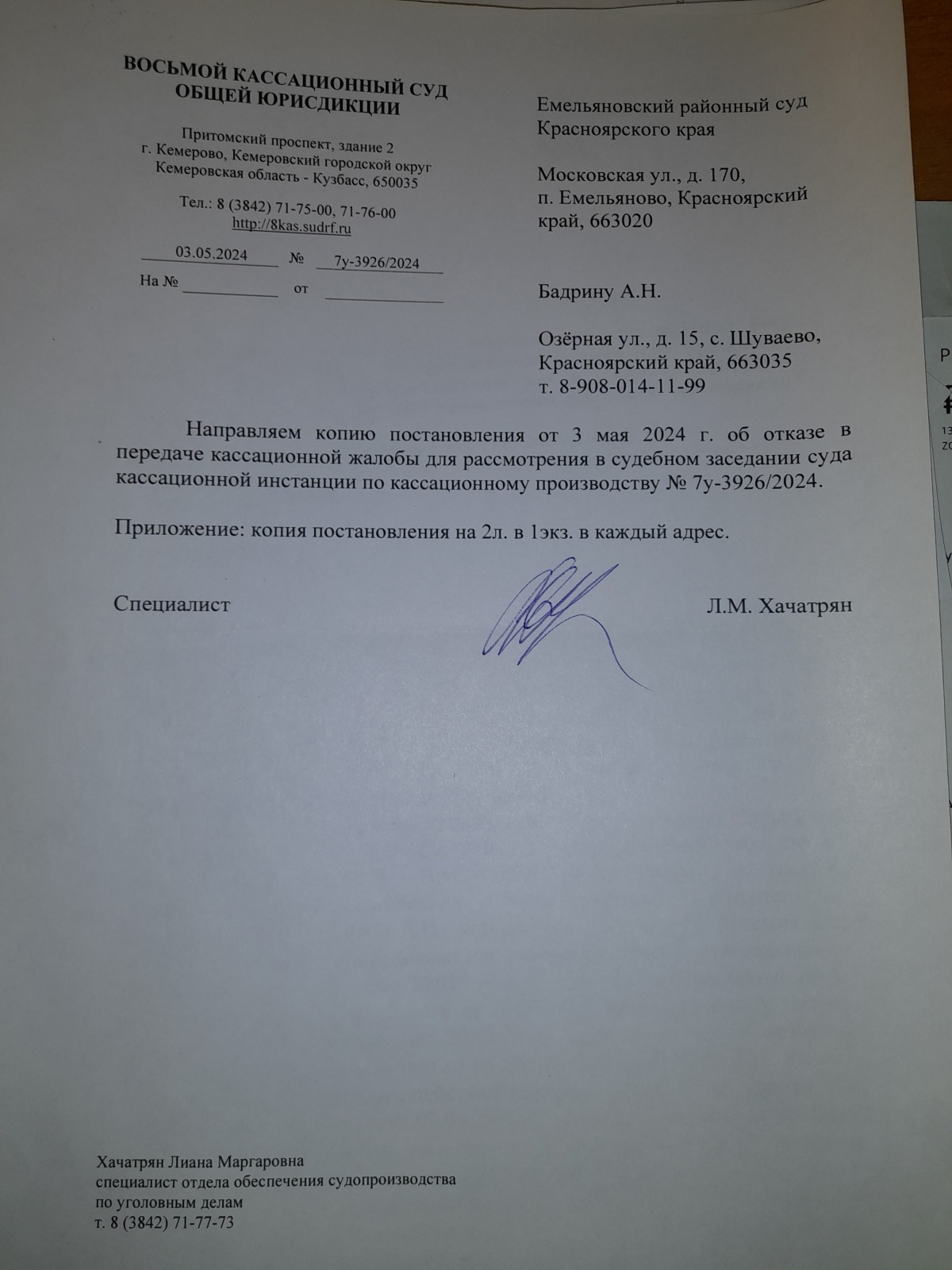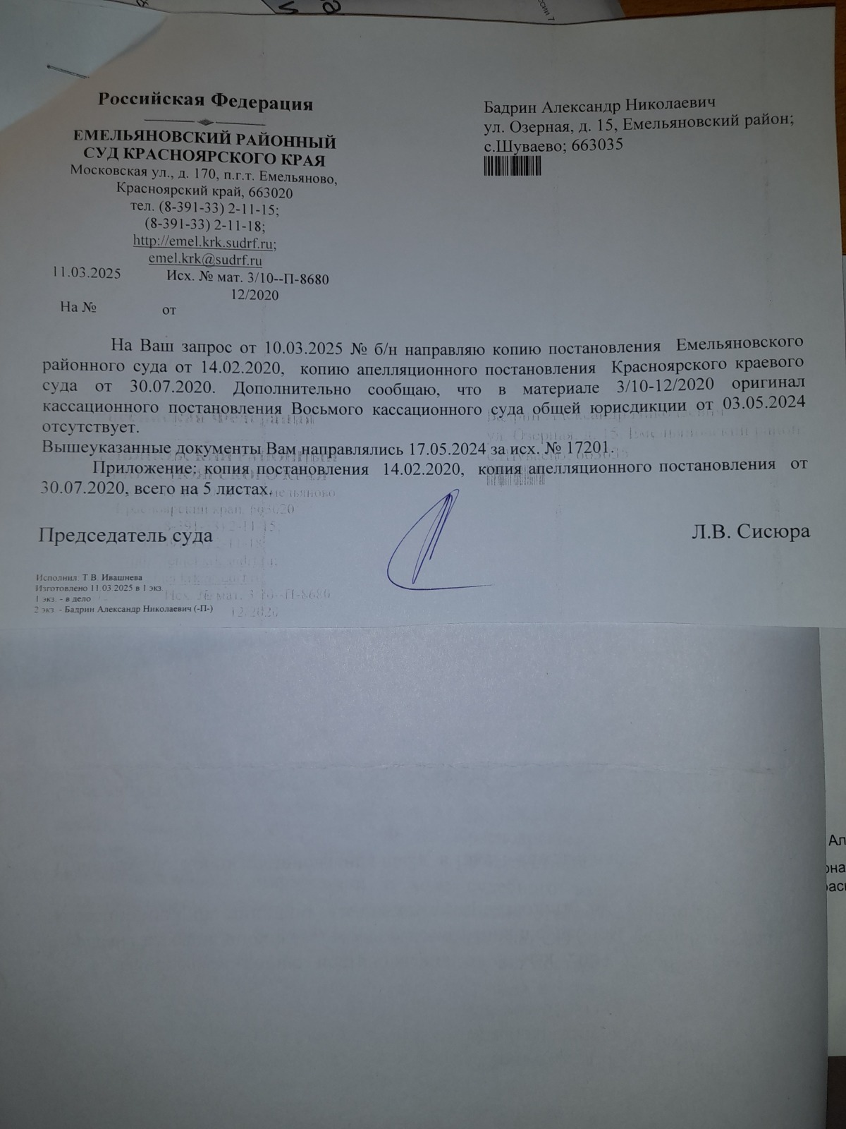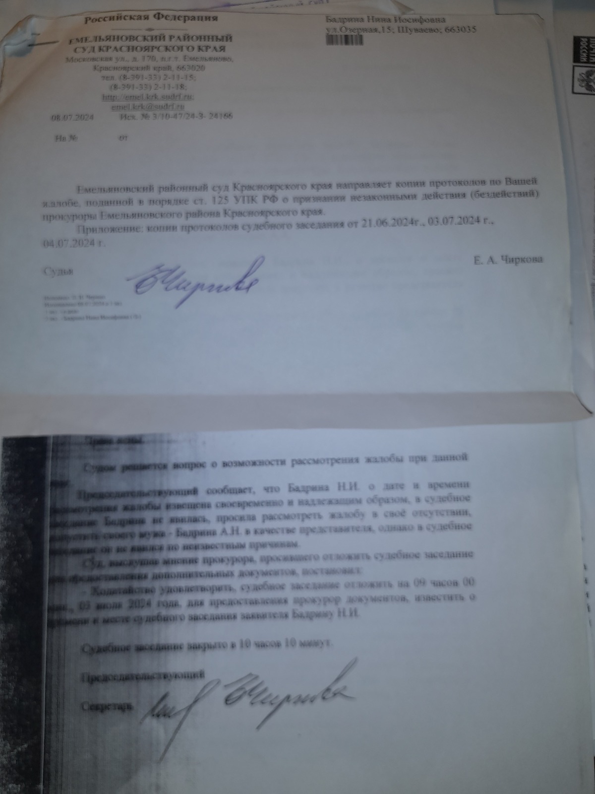 это один суд Красноярского края,перейдем к другому.Когда все таки судья Емельяновского районного суда Чиркова Е.А. осуществила доступ к правосудию