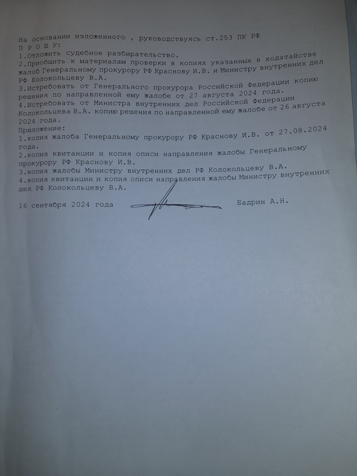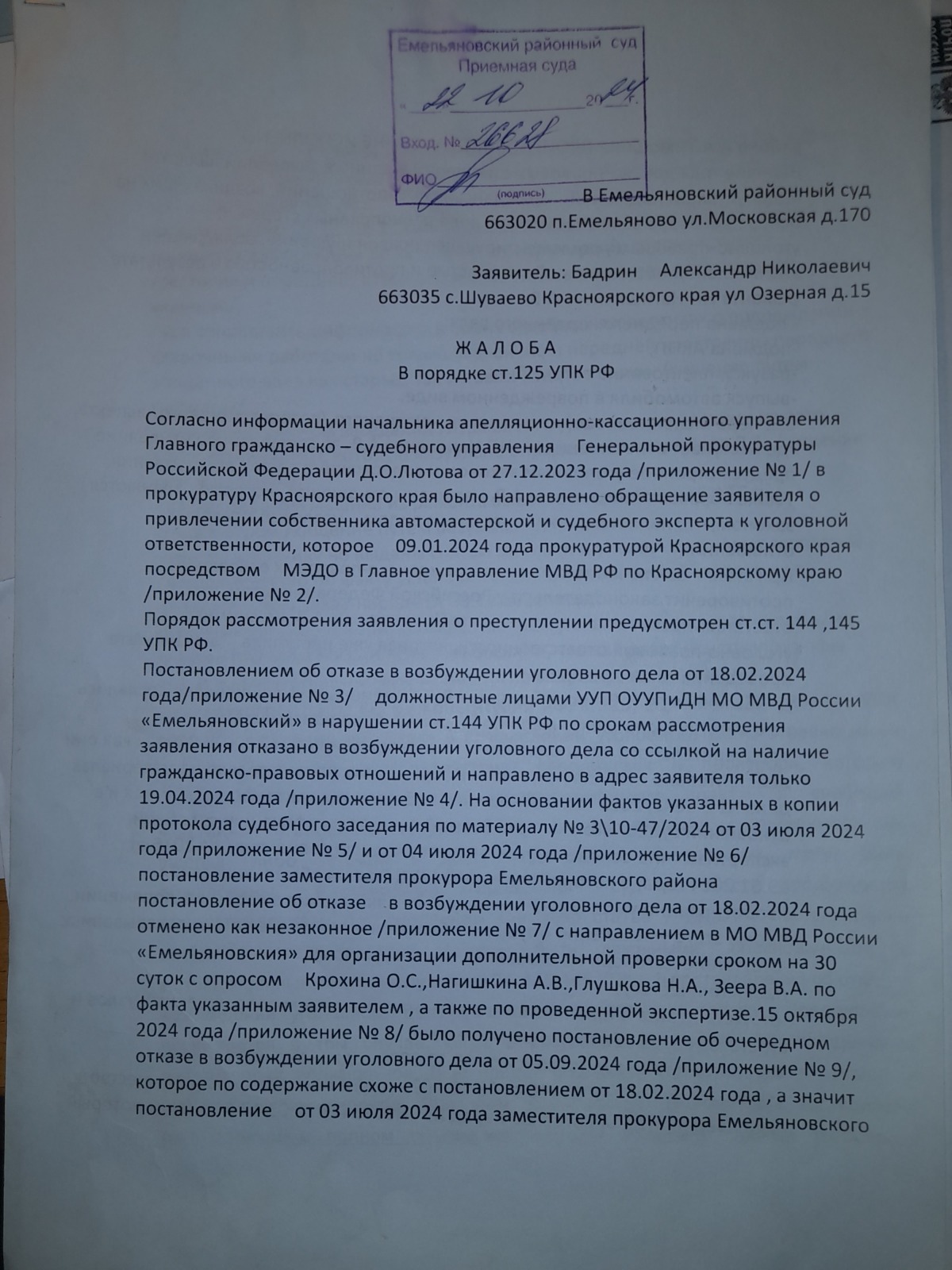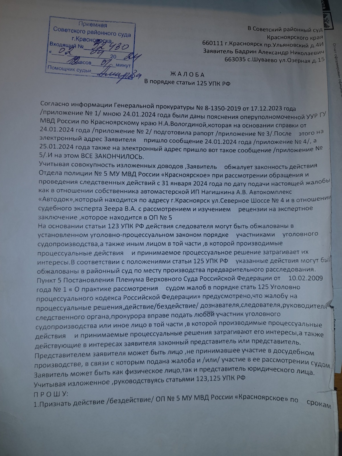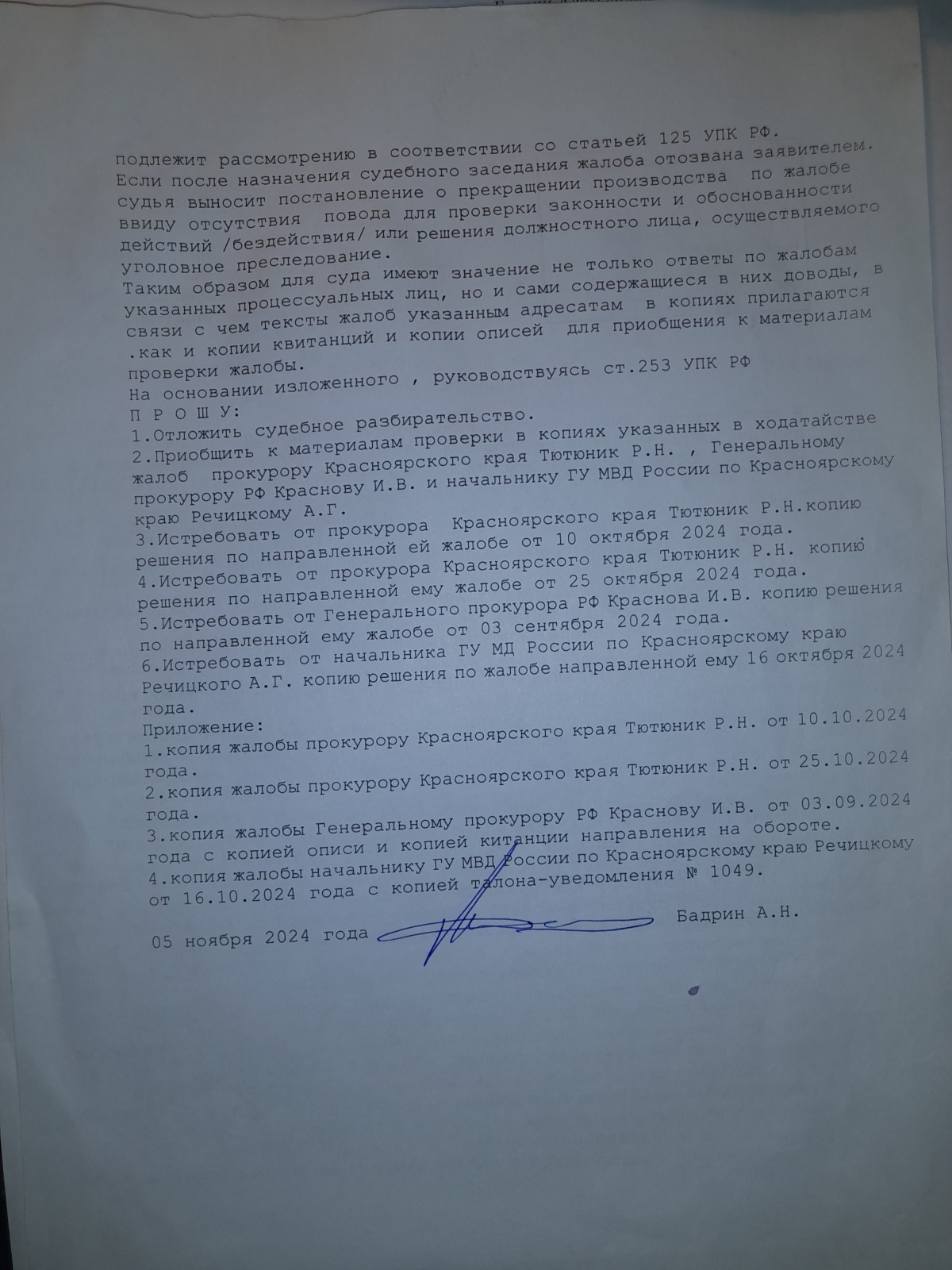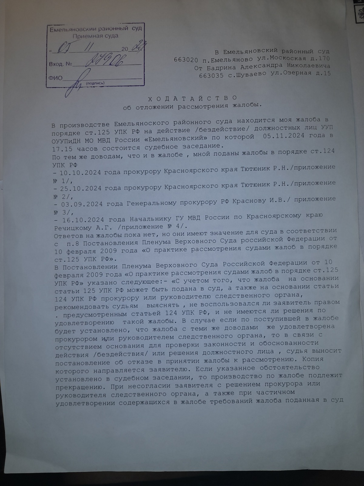 подано ходатайство с перечнем получателей жалоб по ст.124 УПК РФ
