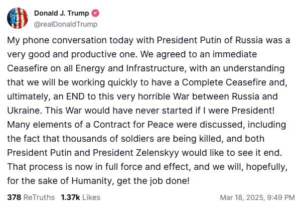 Трамп после телефонного разговора с президентом РФ в своей социальной сети Truth Social выложил пост, где намекнул, что они с Путиным побеседовали «хорошо и продуктивно». Ну это не может не радовать.
