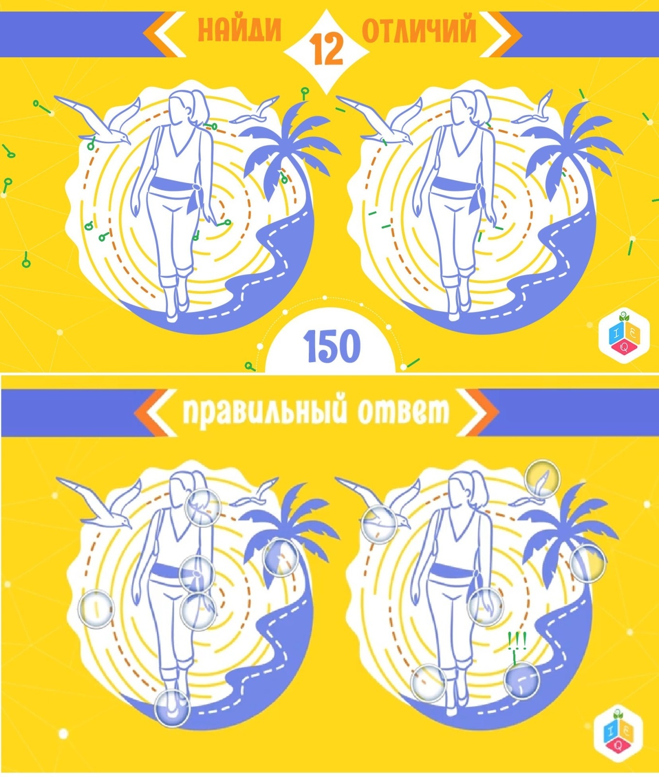 Прилагаю свой вариант решения головоломки, см. копию рисунка. На мой взгляд, количество отличий между двумя картинками превышает 12, тем более, что одного из отличий я не заметил, - оно отмечено 3-мя восклицательными знаками. В указанный Вами тайминг уложился с трудом. Вам, Алёна, успехов и терпения!