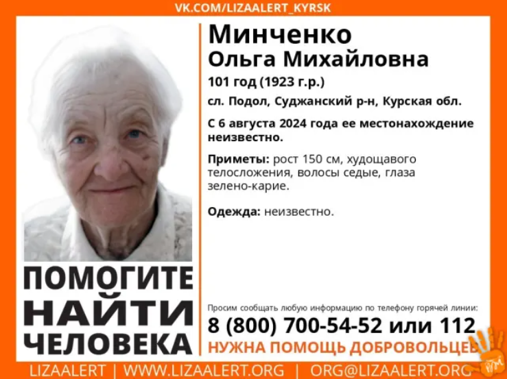 После захвата противником Суджи, родные разыскивали Ольгу Михайловну. Поисково-спасательный отряд «ЛизаАлерт» даже размещал её данные в соцсетях.