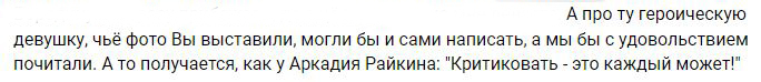 А почему Вас, Андрей Ш., заинтересовала эта Бородина? А, например, не бабушка-ветеран из Суджи, которой 101 год и которую недавно освободили из оккупации? Что-то я Вас не увидела в комментариях под этой публикацией!www.9111.ru А на какую-то Бородину Вы сразу прибежали, да ещё и замечание мне делаете. А про ту героическую девушку, чьё фото Вы выставили, могли бы и сами написать, а мы бы с удовольствием почитали. А то получается, как у Аркадия Райкина: "Критиковать - это каждый может!"