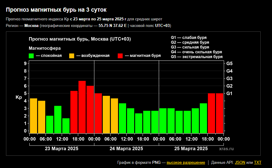 По данным прогнозов, 23 марта уровень геомагнитной активности большой частью дня будет колебаться на уровне пяти баллов. Это уже сигнализирует о "красном" уровне опасности, который указывает на значительное возмущение магнитного поля Земли. Наиболее сильное воздействие ожидается с 6 до 12 часов по московскому времени, когда уровень активности может увеличиться до семи баллов, что соответствует уровню G3 — сильная буря.