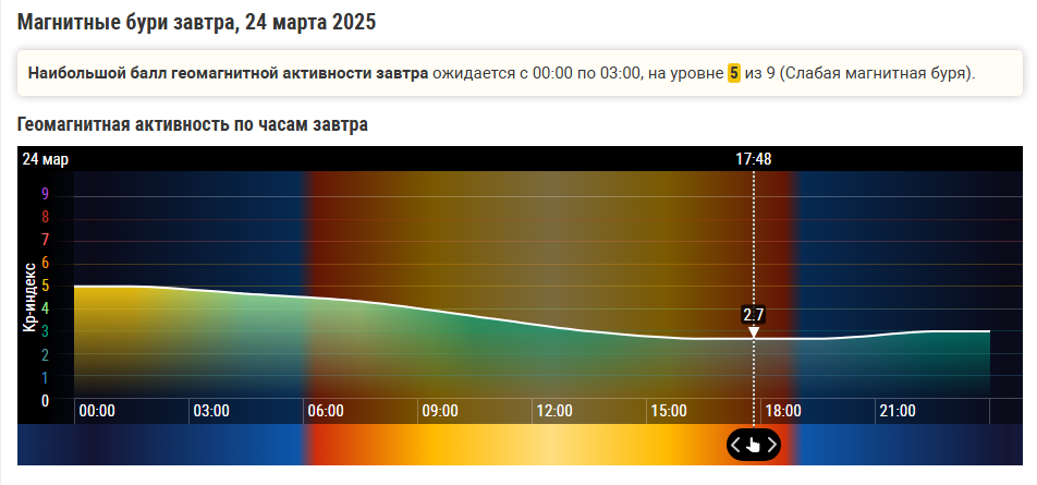 В течение дня 24 марта магнитная обстановка, по прогнозам, будет колебаться в пределах трех баллов, что соответствует зеленому уровню. Это свидетельствует о снижении геомагнитной активности и, соответственно, меньшем риске негативных эффектов от магнитных бурь. Тем не менее, в этот период также стоит оставаться внимательными к возможным отклонениям в работе электроники и связи.