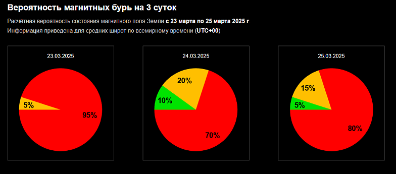 После 23 марта геомагнитная обстановка останется нестабильной. 24 и 25 марта прогнозируются бури силой около пяти баллов, а 27 и 28 марта — новая волна возмущений. Затишье ожидается только после 29 марта.
