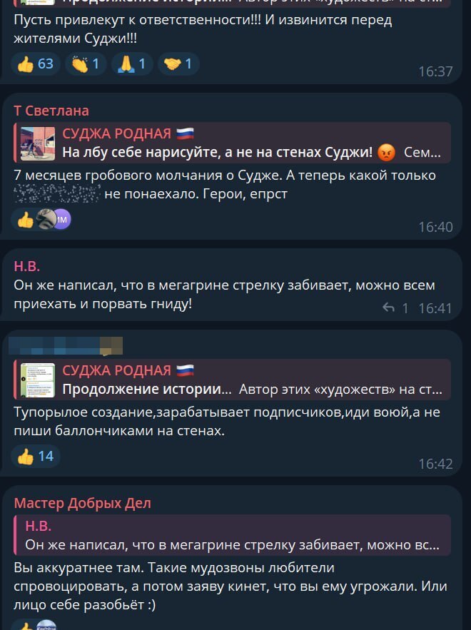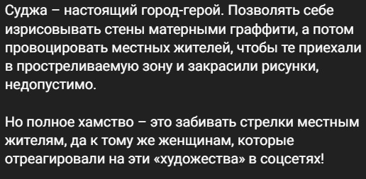 Своё прибытие в закрытую на данный момент зону – недавно освобожденный город Суджа Курской области от украинских боевиков, скандальный блогер решил увековечить на всем, что попадалось под руку. Заборы и стены домов были «с любовью» расписаны мотивирующими надписями и нецензурной бранью.