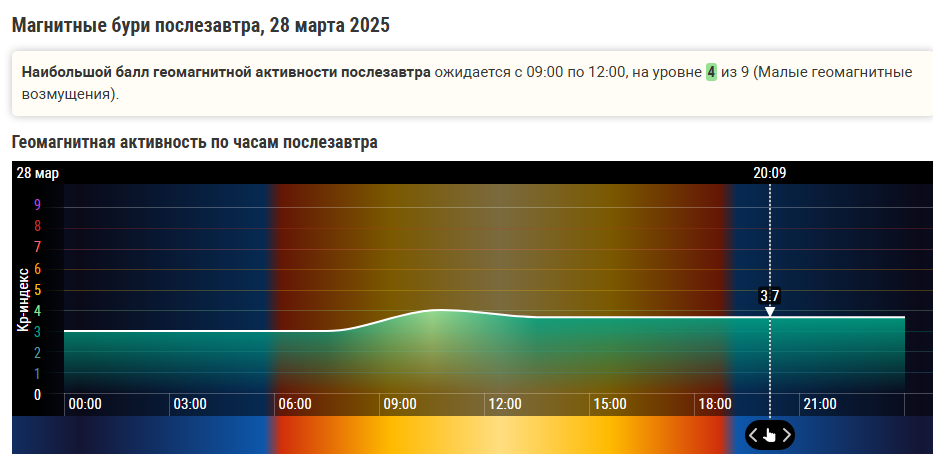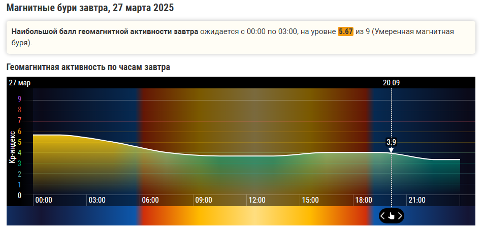 Хвост магнитной бури будет преследовать нас и в пятницу, 28 марта. Индекс ожидается 4 из 9-ти, но кто знает, как именно реальная буря распределится по дням. Так что есть вероятность, что магнитная буря сделает упор на последний рабочий день.