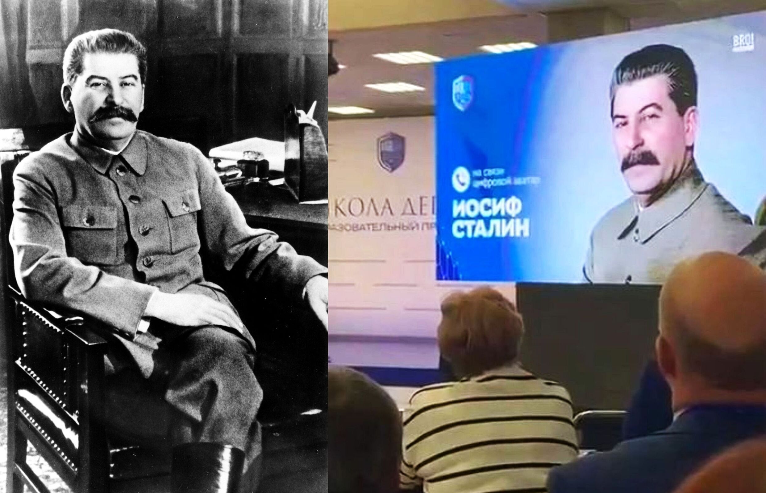 Депутатская школа украшена советскими избирательными плакатами и цифровыми, моргающими и разговаривающими портретами Иосифа Сталина и Ивана Грозного. лишний раз демонстрирующими возможности ИИ.