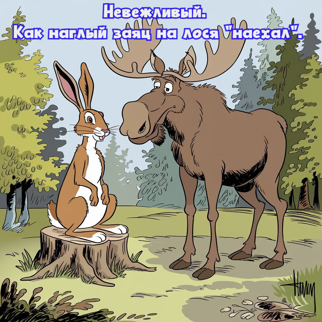 Заяц, по имени Штрих, был известен своей дерзостью и неуважительным отношением к другим обитателям леса. Он бежал по тропинке, не обращая внимания на Рога старого лося, словно считая себя хозяином всего леса. "Эй, лосяра!" - воскликнул Штрих, высокомерно подняв голову. "Ты что, дорогу перегородил? Стой на месте, и дай мне пройти!".