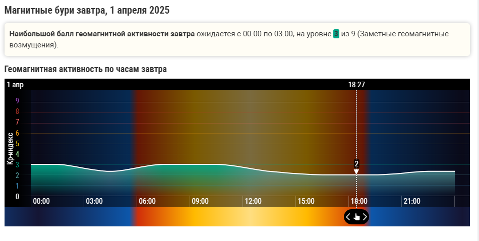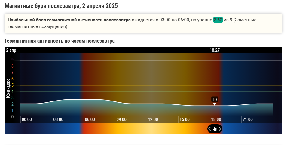 Согласно прогнозам, наибольшая геомагнитная активность 2 апреля 2025 года придется на период с 03:00 по 06:00 по московскому времени. Ожидаемый уровень геомагнитной активности составит 2.67 из 9. Это характеризуется как заметные геомагнитные возмущения, что значительно ниже уровня полноценной магнитной бури.