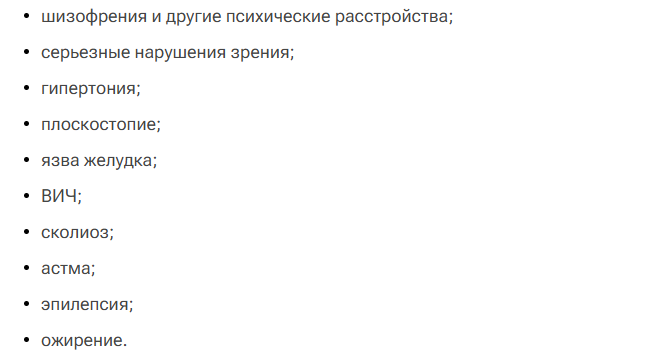Также представлен внушительный список заболеваний, по которым не возьмут в армию. Представлю основные заболевания по которым не возьмут служить.