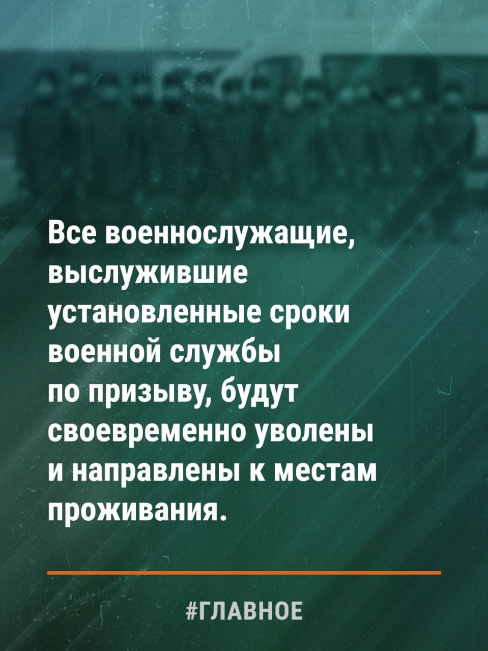 «Все призывники будут направлены для прохождения военной службы в пункты постоянной дислокации соединений и воинских частей Вооруженных сил Российской Федерации и других воинских формирований на территории Российской Федерации. В пункты дислокации подразделений Вооруженных сил Российской Федерации в новых регионах Российской Федерации (Донецкая и Луганская народные республики, Херсонская и Запорожская области) или для участия там в выполнении задач специальной военной операции военнослужащие, проходящие военную службу по призыву, направляться не будут»