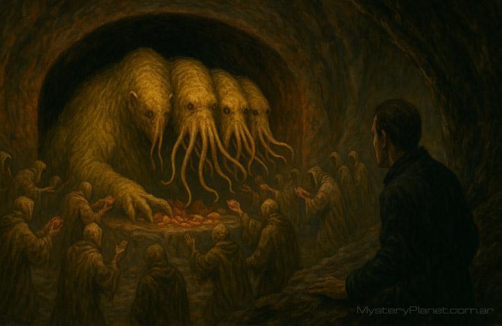 «Чудовища приветствовали нечто, появившееся из тошнотворного отверстия, чтобы забрать отвратительную дань, которую они ему поднесли. Он был очень тяжелым, даже для моего роста; что-то желтоватое и мохнатое, наделенное странными нервными движениями.