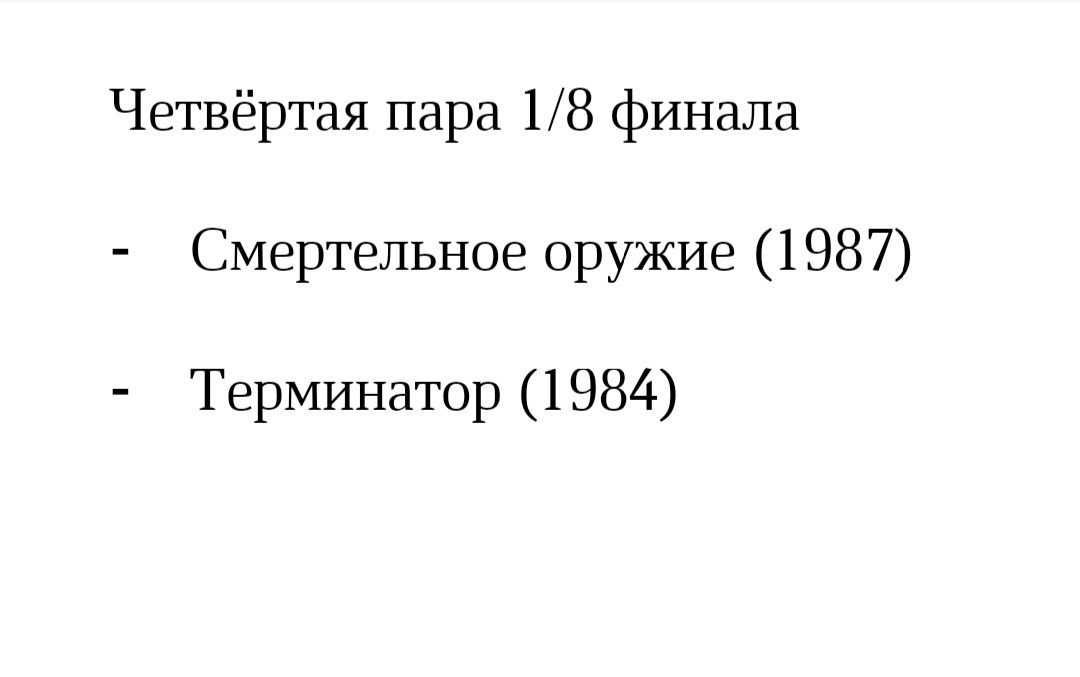 Ну и собственно Смертельное оружие/Терминатор. Опять фильм с Мел Гибсоном, только на этот раз в соперниках у него очередной, более ранний, шедевр от Кэмерона. И тут врятли кто сомневается, что картина со Шварценеггером не пройдёт дальше.