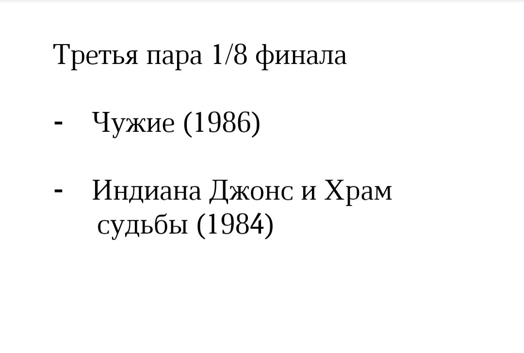 Чужие/ Индиана Джонс и Храм судьбы. В данной паре встретились представитель первой пятерки, занявший третье место и участник третьей пятерки, ставший по итогу голосования вторым.