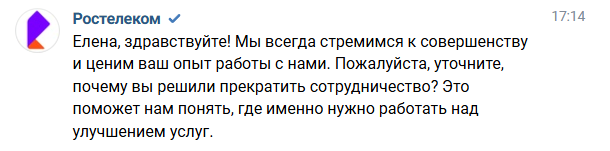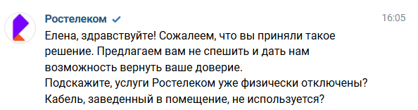 Отправила заявку в личном кабинете Ростелекома о расторжении с ними договора. Тишина. Связываюсь с поддержкой там же — отвечает какой-то бестолковый бот. Тогда решила написать им в личных сообщениях в ВК.