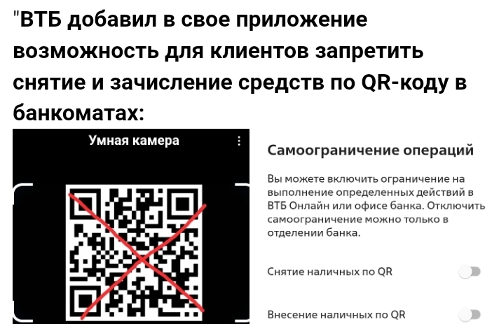 Надеюсь, что кому-то и будет полезно. Самозапреты по QR-кодам - совсем новое предложение от ВТБ - не все про него слышали...