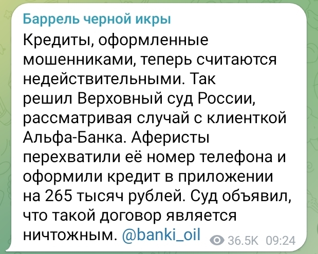 "Кредиты, оформленные мошенниками, теперь считаются недействительными. Так решил Верховный суд России, рассматривая случай с клиенткой Альфа-Банка. Аферисты перехватили её номер телефона и оформили кредит в приложении на 265 тысяч рублей. Суд объявил, что такой договор является ничтожным..."