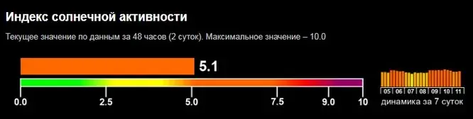 Прогнозируемое значение индекса Ap, который также отражает геомагнитную активность, составит 12. Уровень солнечного радиопотока F10.7 ожидается на отметке 140 единиц.