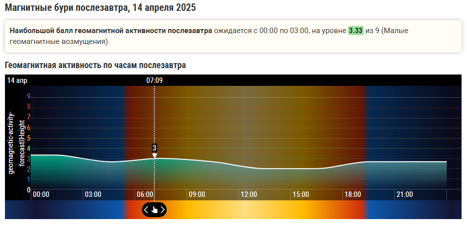 13 апреля ожидается геомагнитный шторм с индексом Kp 4, что обозначает умеренное воздействие солнечной активности на магнитное поле Земли. В течение следующего суток после пика шторма предсказывается небольшое геомагнитное возмущение на уровне Kp 3.